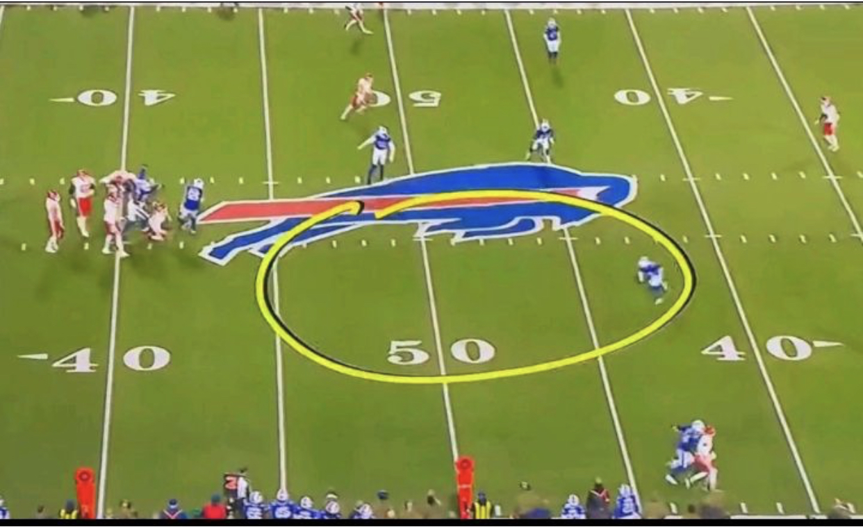 Initially, the pass was ruled as simply an incomplete pass, but after a crew discussion — intentional grounding is a crew call — referee Carl Cheffers dropped his flag. Mahomes initially argued that his arm was hit while he was throwing the ball, but it was not.