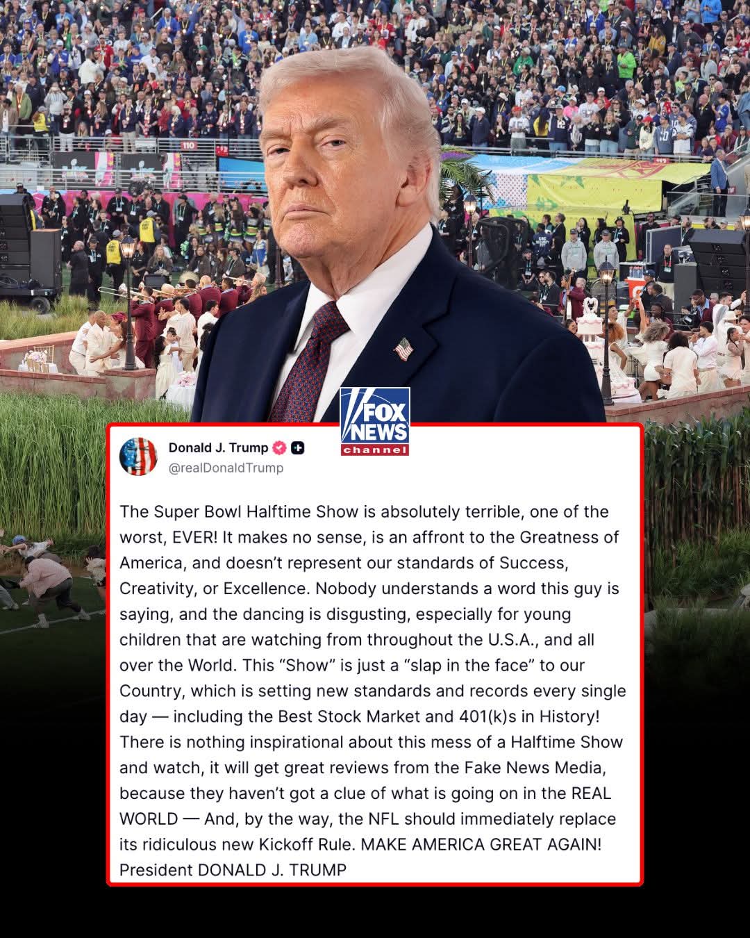 Donald Trump sharply criticized Bad Bunny’s Super Bowl LX halftime performance, calling it “absolutely terrible” and “one of the worst ever” in a post on his Truth Social platform after the show aired. He said the performance “makes no sense,” “is an affront to the Greatness of America,” and doesn’t represent what he describes as American standards of success, creativity, or excellence.