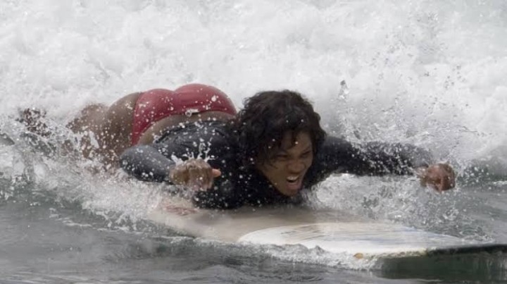 She’s out in the ocean, black rash guard clinging to her legendary frame, red bottoms flashing against the white foam. The sun is high, the water is glassy, and for a split second, everything looks perfect.